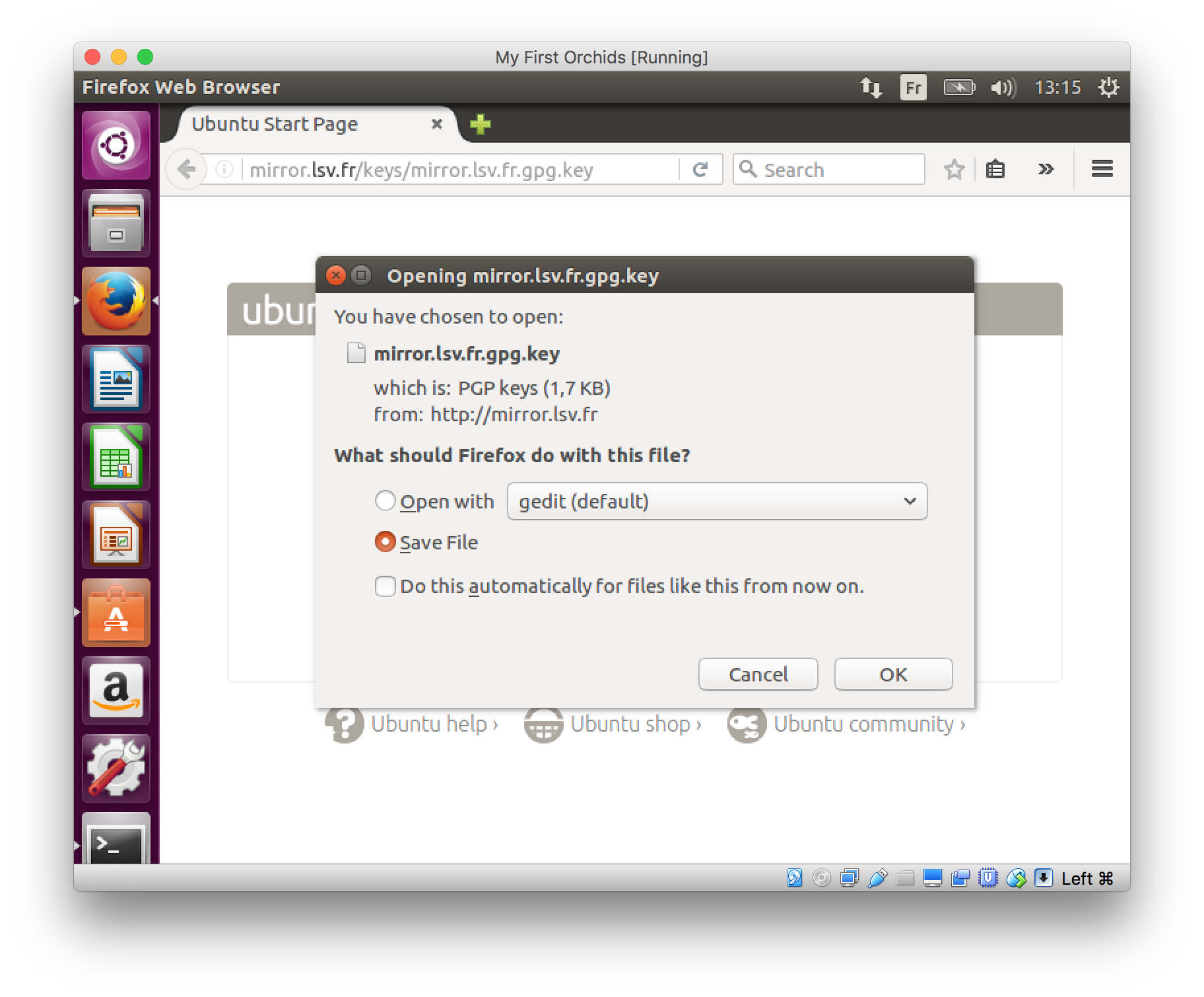 In your Web browser, click here. You will be asked what to do with file mirror.lsv.ens-paris-saclay.fr.gpg.key. (I’m going to explain how this works under Ubuntu. For other Linux distributions, you may have to do something slightly different.)