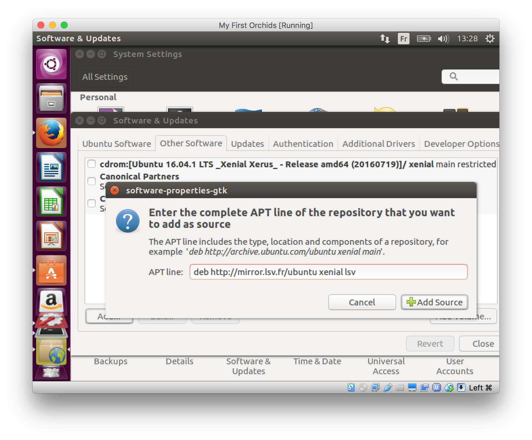 Click the ‘Add…’ button, and enter ‘deb https://mirror.lsv.ens-paris-saclay.fr/ubuntu xenial lsv‘ into the dialog box. This informs the mirror that we are interested in Ubuntu distributions, and the version is xenial. Change that to debian and stretch for a Debian distribution, version stretch, for example.