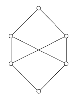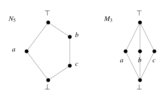 Case 2. b and c are incomparable.  If ac then (*) simplifies to ba ≰ sup (ba, bc), which is impossible.  If ac then (*) simplifies to bc ≰ sup (ba, bc), which is impossible again.  So a and c are incomparable.  If ab then (*) simplifies to bbc.  If a<b then we recognize a copy of N5 again, with b atop a, c on the side, plus a top element and a bottom element.  Otherwise, a and b are incomparable, and together with a top and a bottom obtained as sup(a,b,c) and abc respectively, one recognizes a copy of M3.     ☐