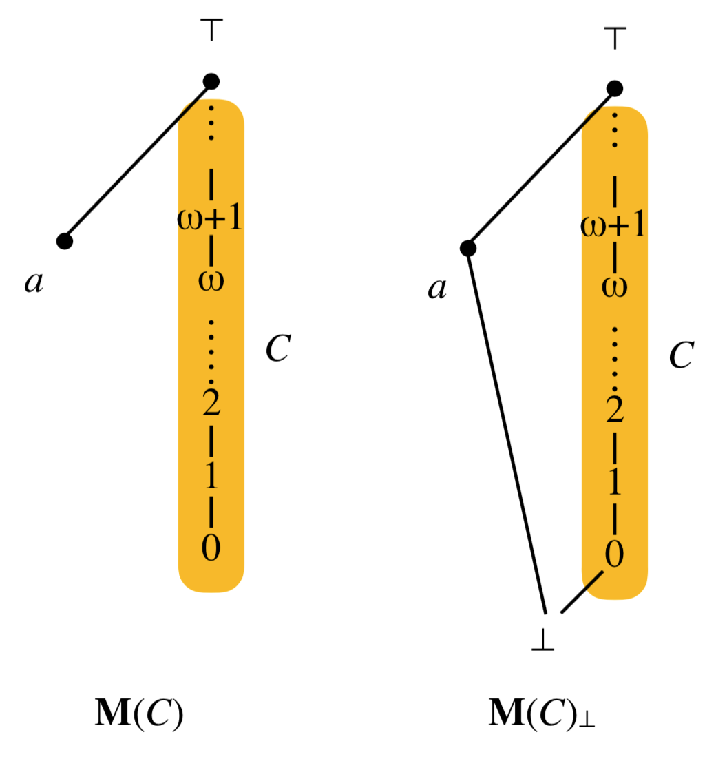 For now, imagine we have such an a and C.  That gives us a copy of M(C) order-embedded in X, together with sup C, which we label ⊤ (that need not be the top element of X, though, even if there is one).