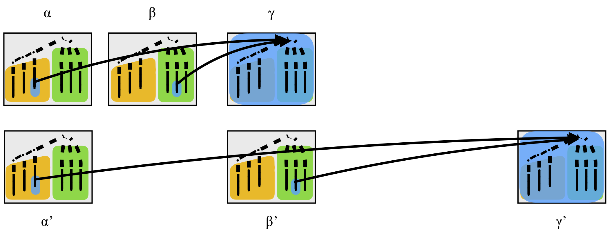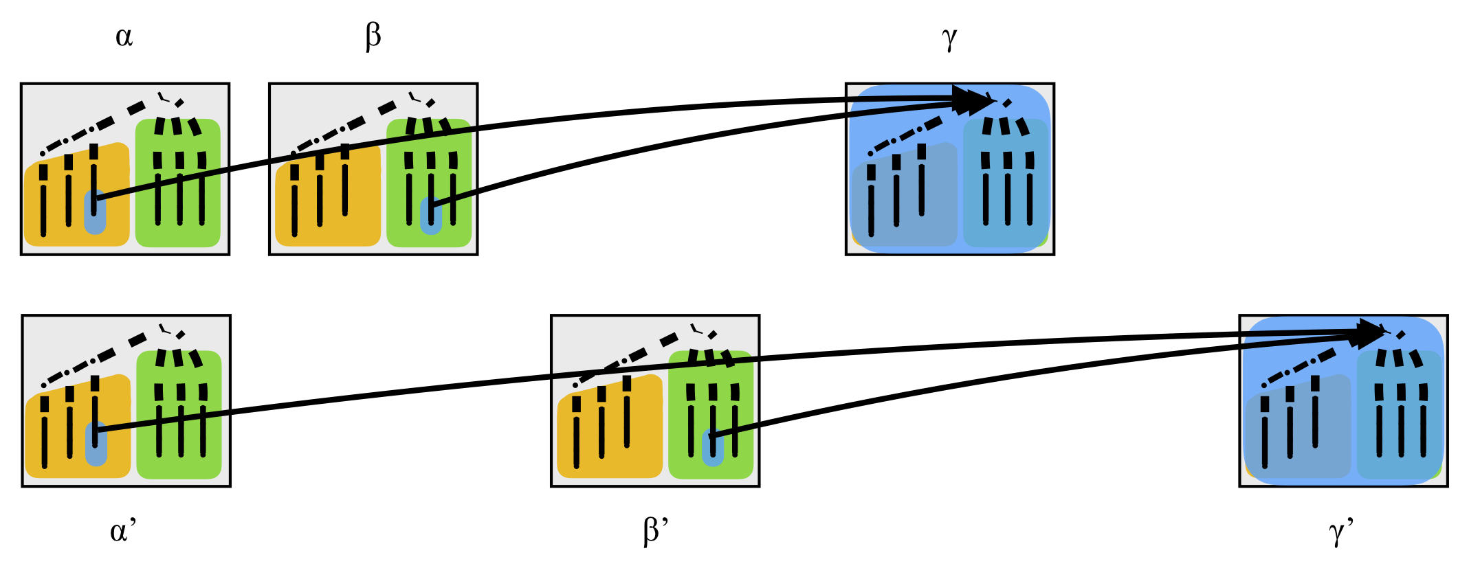 Still in case 1, it may also be that β=β’ and f≠f’, in which case the intersection is just one Type I ideal from gadget α. The final subcases, where β≠β’, γ≠β’ or β≠γ’, gives the same kind of result, see the following picture.