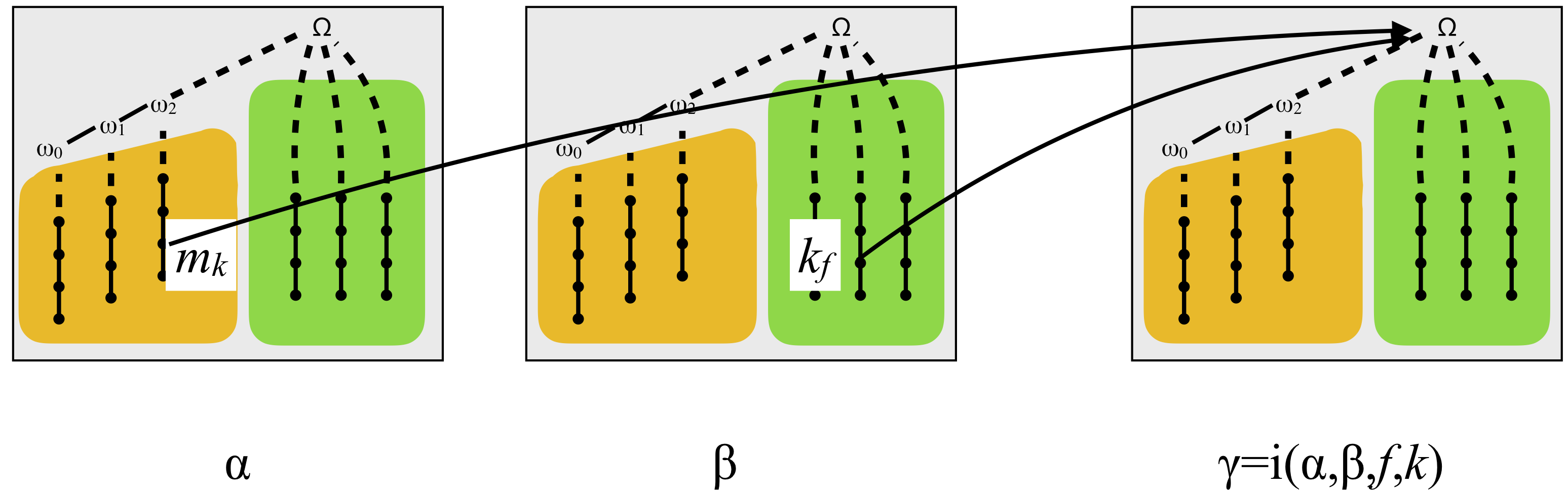 - we pick element Ω from gadget γ, for some γ>α,β that is uniquely determined as a function i(α, β, f, k) of α, β, f, k (and m=f(k) and n=k), and we declare that that element is above both mk and kf. See the picture below. This actually makes that element Ω from gadget γ the supremum of mk (from gadget α) and nf (from gadget β).