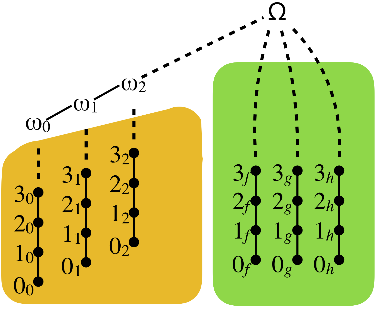 On top of each orange column k, we add an element ωk, and we order them by ω1 ≤ ω2 ≤ … ≤ ωk ≤ … On top of that, we add a top element Ω.