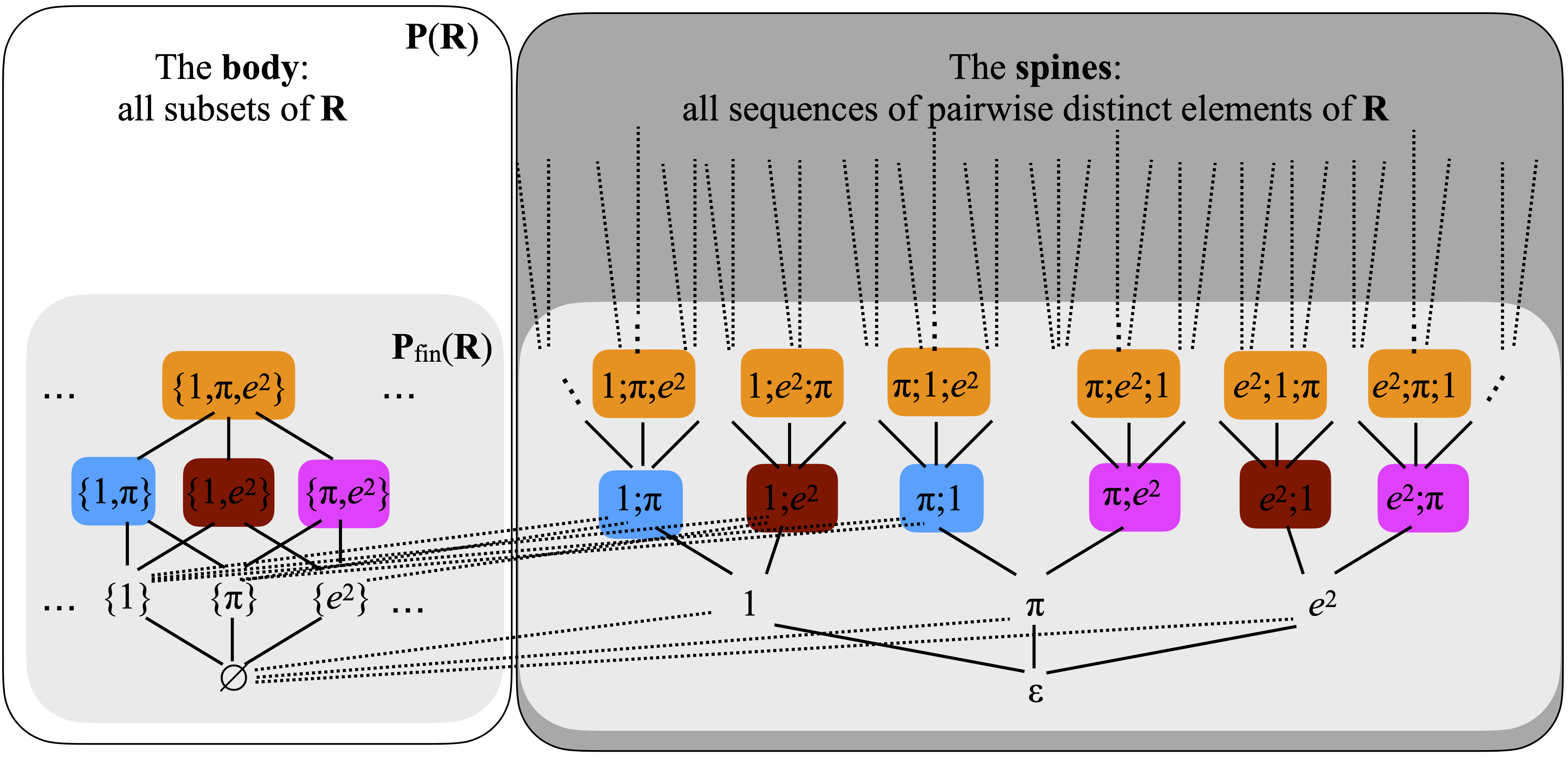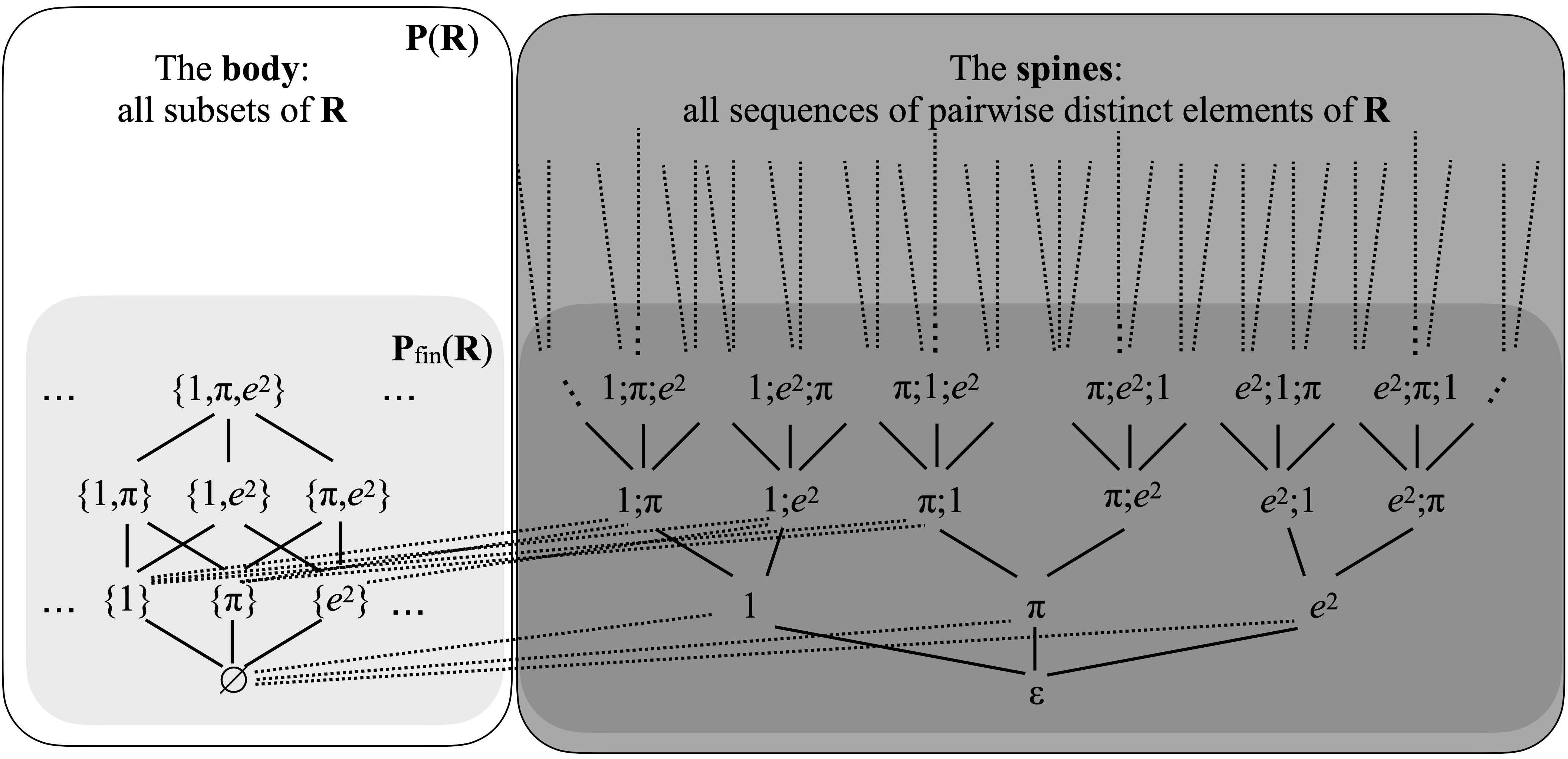 On the left, I have drawn a wee bit of the family of finite subsets of R, and the solid edges represent the basic inclusion relations. The right part displays some of the finite sequences (with pairwise distinct elements), ordered by prefix. I should have drawn a gazillion dotted edges representing the ordering relationships between sets and sequences, but that would have been really messy. Still, let us take an example. Take any sequence, for example 1;π. It has only one sequence immediately below it, and that is 1. It has two sets immediately below it, {1} and {π}. As for the elements immediately below 1;π;e2, you should find just one sequence, 1;π, and three sets: {1,π}, {1,e2}, and {π;e2}.
