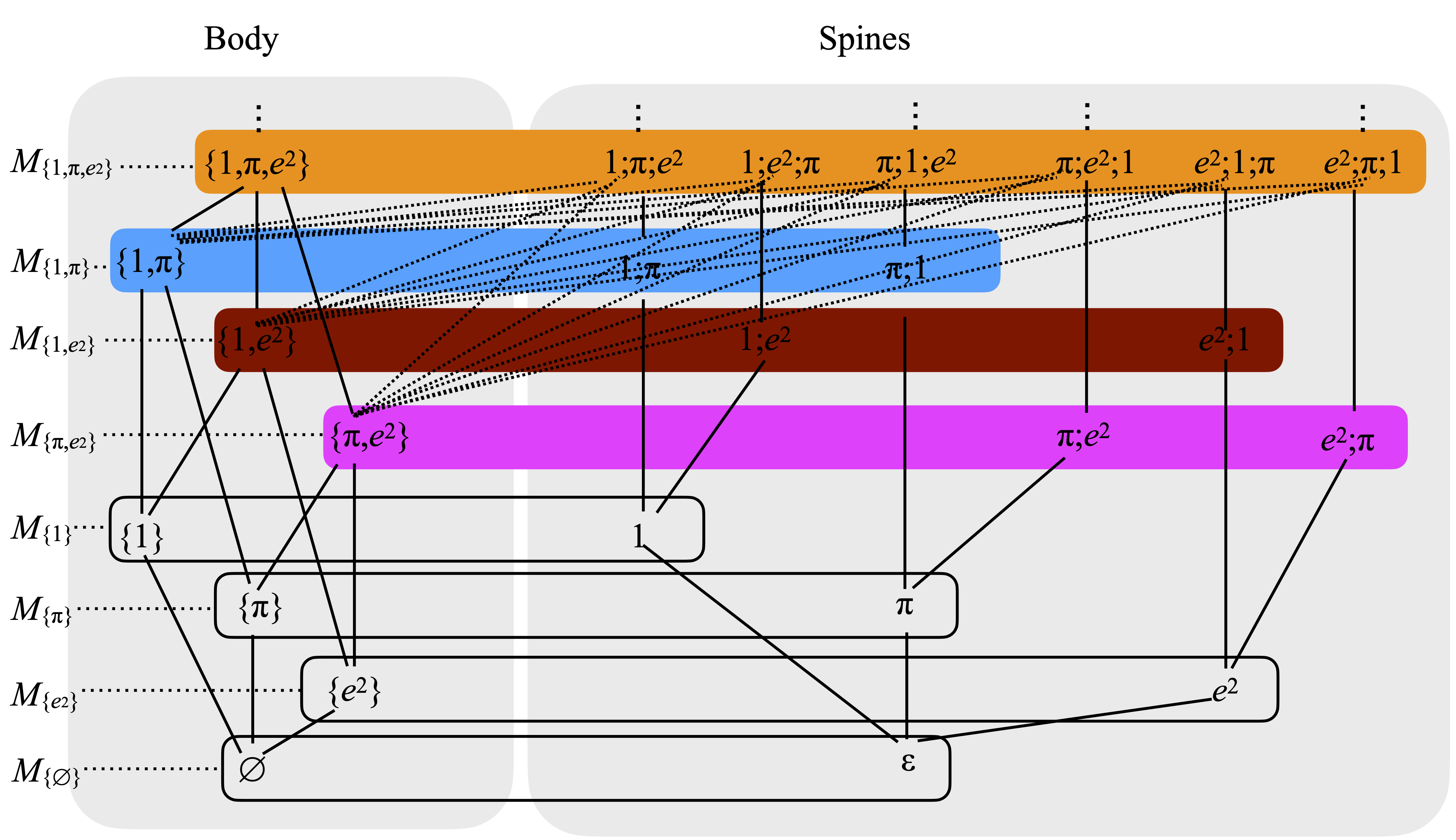 It may help to reorganize that picture, and group elements by color. This way, the sets Mα appear more clearly. Let me do that, concentrating on the elements built out of 1, π, and e2 alone. By now, the picture starts to match the definition of Exercise 6.2.23-11 of [1] more visibly. (Again, the dotted lines are not all the inclusion relations that exists between sets, in the body part, and sequences, in the spines part. But I have shown all of those that exist among the top four lenses—the ones I colored.)