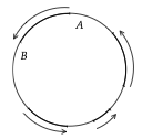 However, if X is the whole circle S1, the monotonicity requirement implies that ⊑X contains all the preorderings ⊑U, where U ranges over all the arc segments, such as ]A, B[. This implies that any point x must be lower in the ⊑X preordering than any point y that you can reach by traveling counterclockwise… but this is the case for all points y. So ⊑X must be the trivial preordering that declares every point less than or equal to any point.