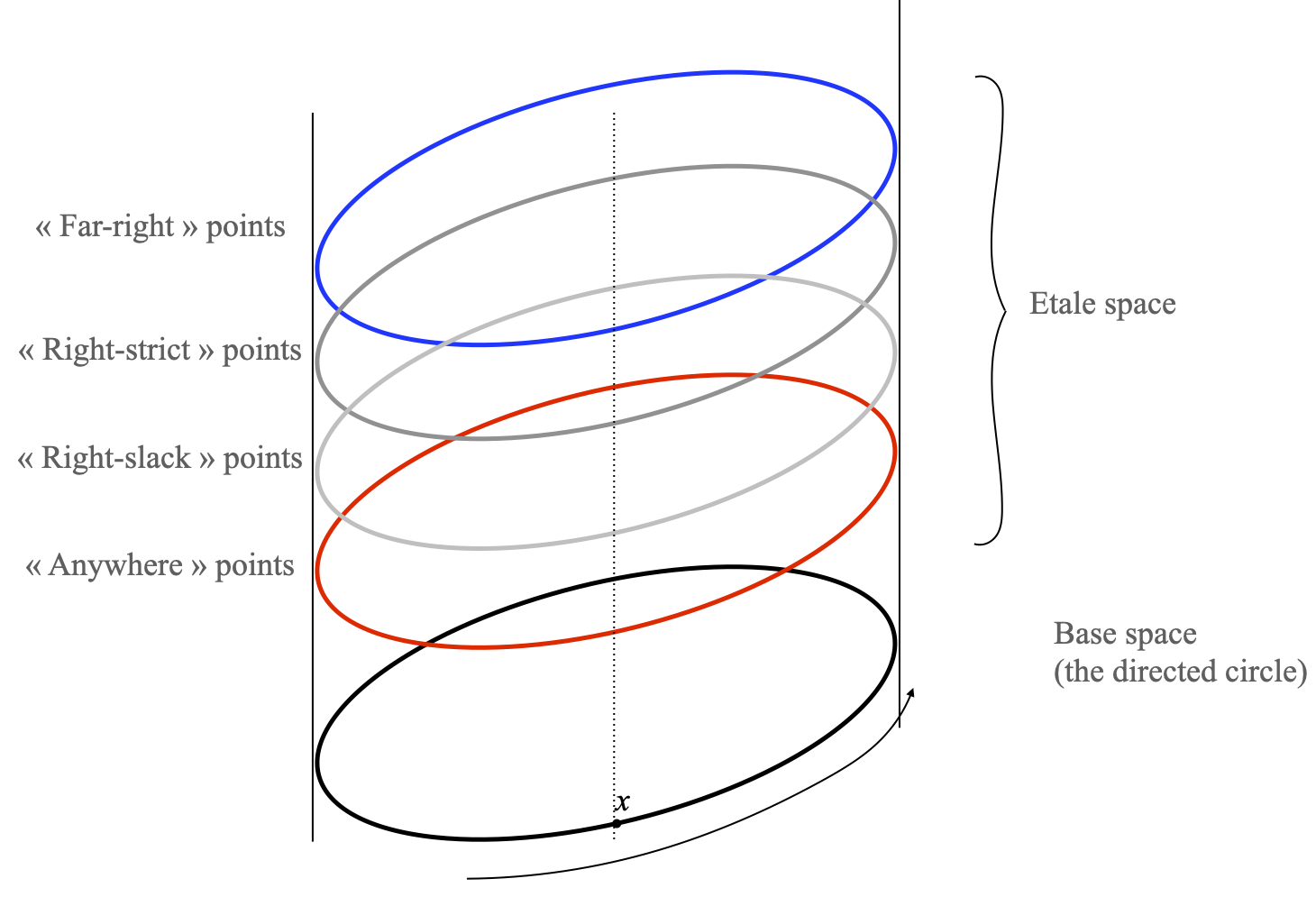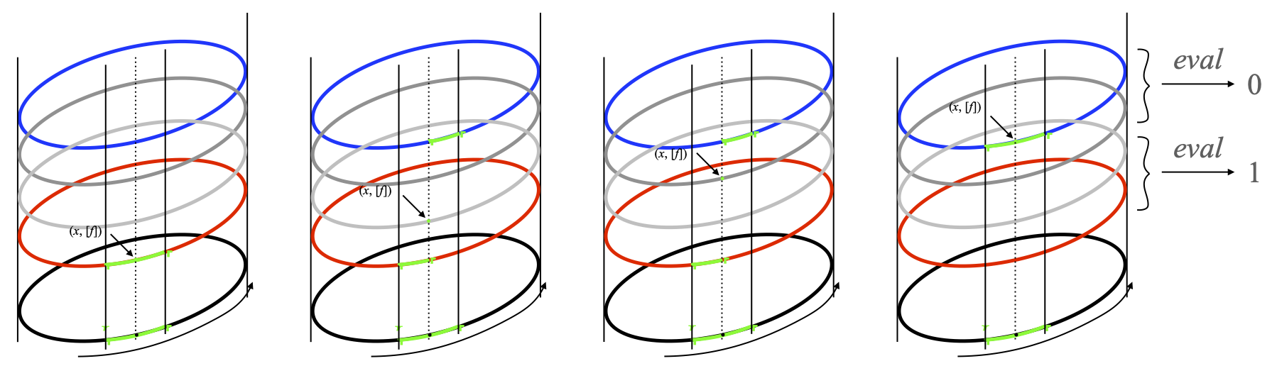 This should be read as follows: we consider points (x, [f]), which can be on any of the four stacked circles that form the étale space of the directed circle (all except the bottom circle); depending on which of these circles it lies on, I have drawn an open neighborhood of that point in green. If (x, [f]) is in any of the two intermediate cases (the second and third stacks, from left to right), then that neighborhood contains (x, [f]), and that is the only point of that open neighborhood that lies on the same circle, and then it also contains a green region from the topmost (blue) circle to and a green region from the bottommost (red) circle of the stack. Looking at images by the eval map, (x, [f]) is sent either to 0 or to 1, but its open neighborhood contains a part in the blue circle, which gets sent to 0, and a part in the red circle, which gets sent to 1. This shows that neither eval–1({0}) nor eval–1({1}) is open. Therefore the only topology on P = {0 < 1} for which eval is continuous is the coarse topology.