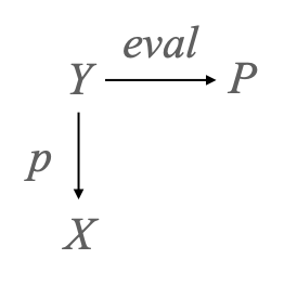 When Y=S(X, F) and F is the sheaf of locally monotone maps from a prestream (X, (⊑U)U ∈ OX) to P, there is an obvious map from Y to P, which I will call eval: for every point (x, [f]) of S(X, F), let me define eval(x, [f]) as f(x). In the example of the directed circle, where we had in fact taken P to be {0 < 1}, eval maps the top two circles (“far-right” and “right-strict”) to 0, and the next two circles (“right-slack” and “anywhere”) to 1.