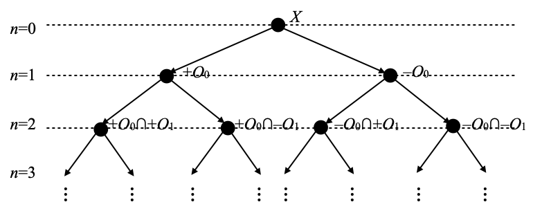 This tree is organized in levels, indexed by natural numbers n, and vertices at level n are labeled with intersections of sets ±O0, ±O1, …, ±On–1, where the signs ± may be chosen independently as + or –. By convention, I will write +Oi for Oi, and –Oi for its complement.