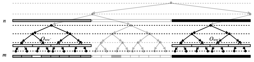 All in all, transitions rewrite all clopen chunks Ow at level n to corresponding unions of smaller clopen chunks at level m, and here is a picture where we have exactly one clopen chunk Ow of each kind: