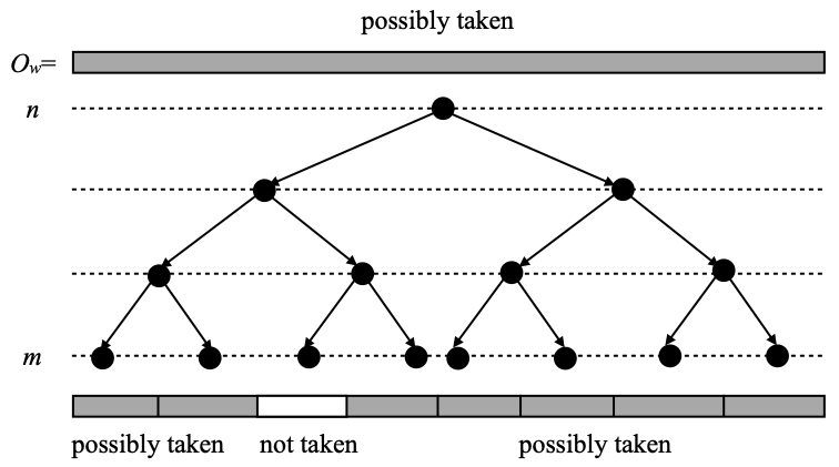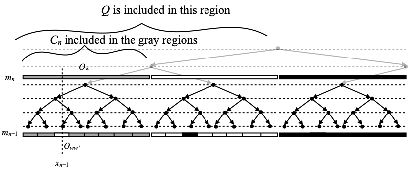 Proof. This should be obvious from the picture below, where the two possible cases we have for w are when Ow is colored gray (left) or black (right), not white; recall that ψ(m,f) is the union of the gray and black regions on the bottom row (level m). The sets Oww’ that are mentioned in the lemma are those one level above the bottom row, not on the bottom row (those are the small light gray rectangles, and we have shown eight of them). It is important that all those sets Oww’ be non-empty, and this is why we label the vertices of the complete binary tree by non-empty clopen sets only. ☐
