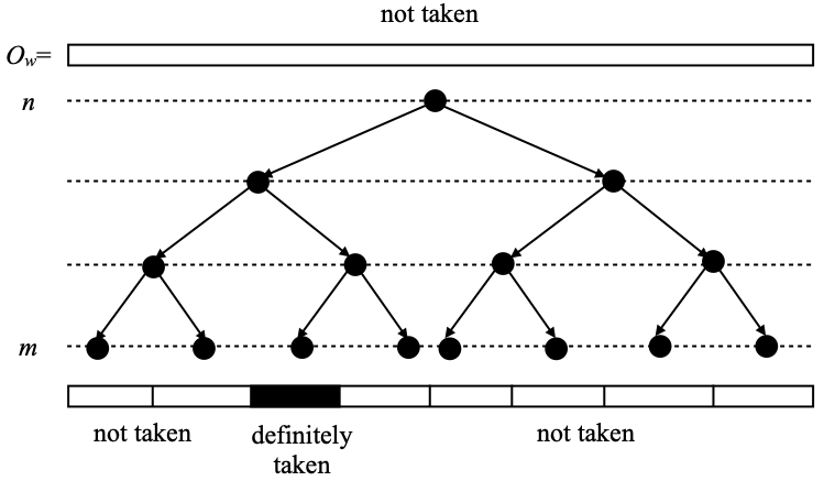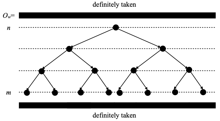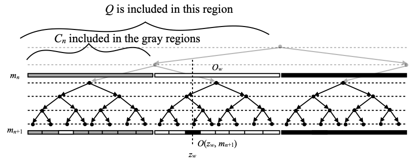 (Bn+1) is harder to satisfy, because of the moves of the second kind, namely those by which we replace a clopen chunk that is not taken at level mn (in white) by several smaller clopen chunks at level mn+1, of which exactly one is now definitely taken (in black). See the picture below. (The point zw and the clopen chunk O(zw,mn+1) will be constructed in a moment.)