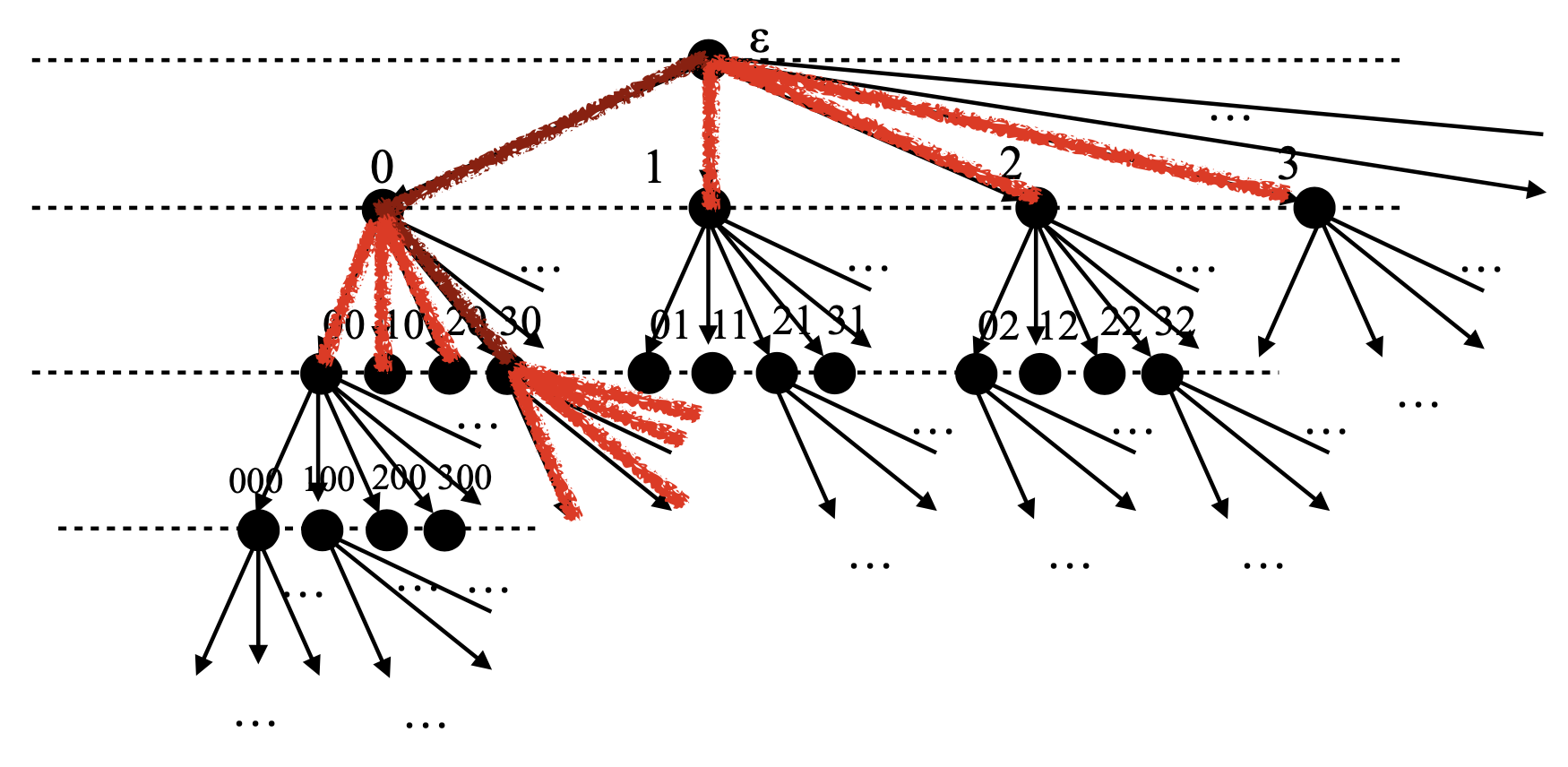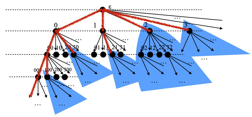Tσ,n is defined as consisting of ε, plus the sequences k::s, where 0≤k≤|σ|+n and s ranges over the suffixes of σ. (|σ| denotes the length of σ.) In other words, draw the path from the root ε to σ, and add the first |σ|+n+1 successors of each node thus obtained. Here is what Tσ,n is for σ = 2::0::ε and n=1. The path σ itself is shown in brown, and the additional successors are obtained by following the additional red edges.