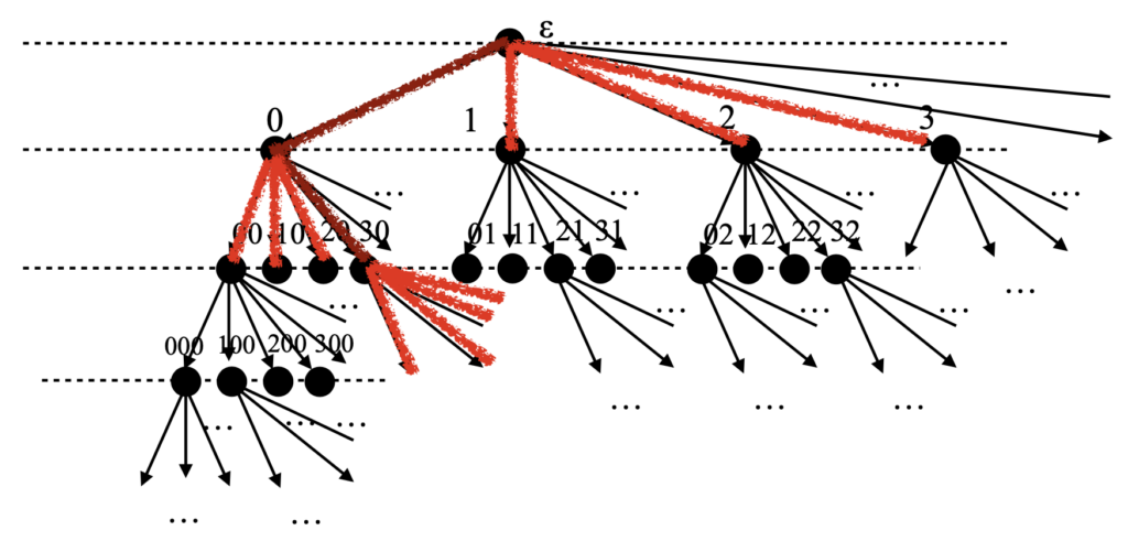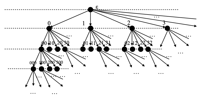 M. de Brecht defines specific open subsets Uσ,τ, where σ and τ are finite lists of natural numbers, but I will make two modifications to this presentation. First, τ is not really used in the definition except for its length, so I will replace it with a natural number n, and I will write the corresponding open sets as Uσ,n. Second, it is easier to understand what these open sets are through the trees Tσ,n that are used to define them.