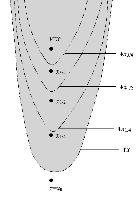 This allows us to make sense of xa for all numbers a that we can write as p/2n+1, 0≤p≤2n+1. By induction on n, we have defined a family of points xa, a ∈ I2, such that x0=x, x1=y, and such that a<b implies xa ≪ xb.